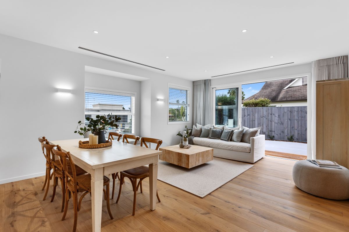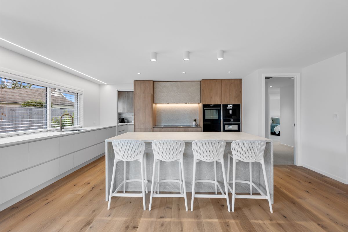 This Mount Maunganui home combines luxury, meticulous craftsmanship, and bespoke design, featuring a bespoke kitchen, angled cedar and Belgian brick cladding, and travertine-clad bathrooms.